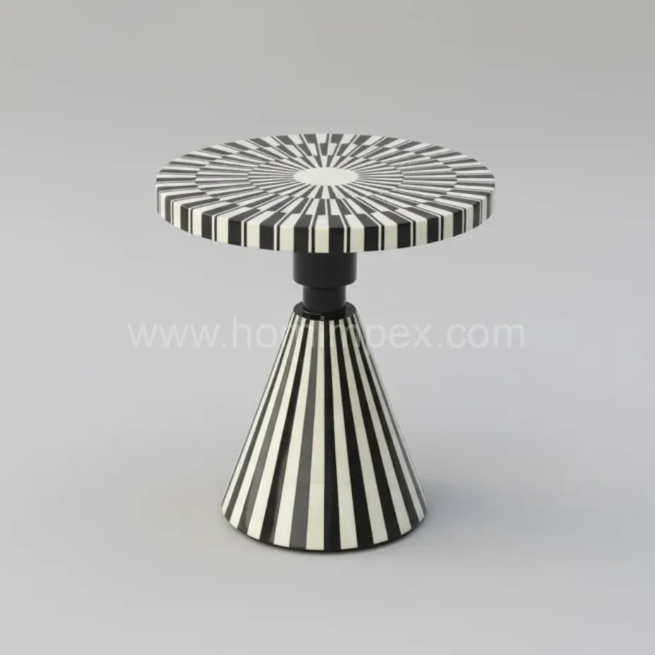 The accent table features a mesmerizing monochromatic striped pattern across both the conical base and the circular tabletop. The intricate inlay work uses ethically sourced natural bone fragments, meticulously cut and set into a black resin to create a bold, optical design. The contrasting colours and radial pattern give the table a dynamic, modern flair that complements various decor styles, from contemporary minimalist to art deco inspired.
