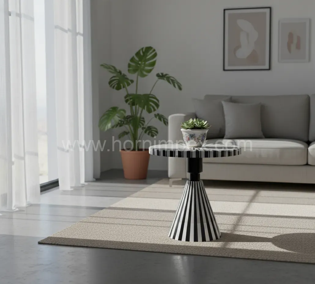 Elevate your living space with our striking Black & White Bone Inlay Striped Accent Table. Handcrafted by skilled artisans in Sambhal, Uttar Pradesh, India, this unique piece embodies the exquisite tradition of Indian bone inlay furniture.
