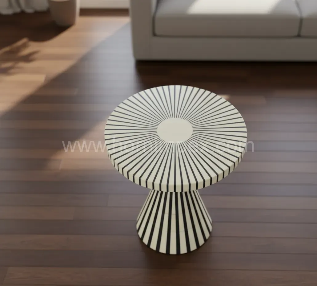 Bring a touch of artisanal luxury to your home with this exquisite Handcrafted Bone Inlay Side Table. Manufactured and exported from Sambhal, Uttar Pradesh, India by HornImpex, this table showcases the finest traditions of Indian bone inlay craftsmanship.