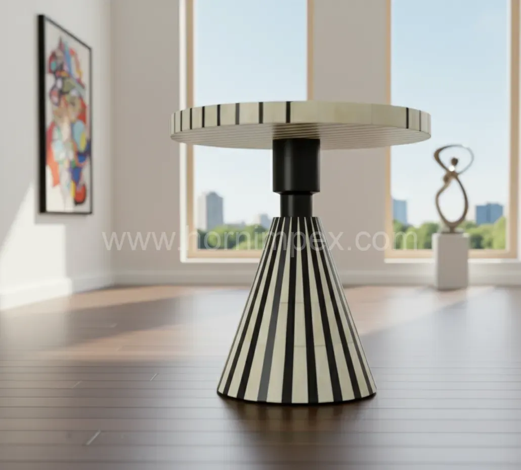 The table features a captivating geometric black and white stripe pattern, meticulously formed by setting ethically sourced bone pieces into a durable black resin. This labor-intensive process results in a smooth, vibrant surface and a piece of furniture that is truly one-of-a-kind.