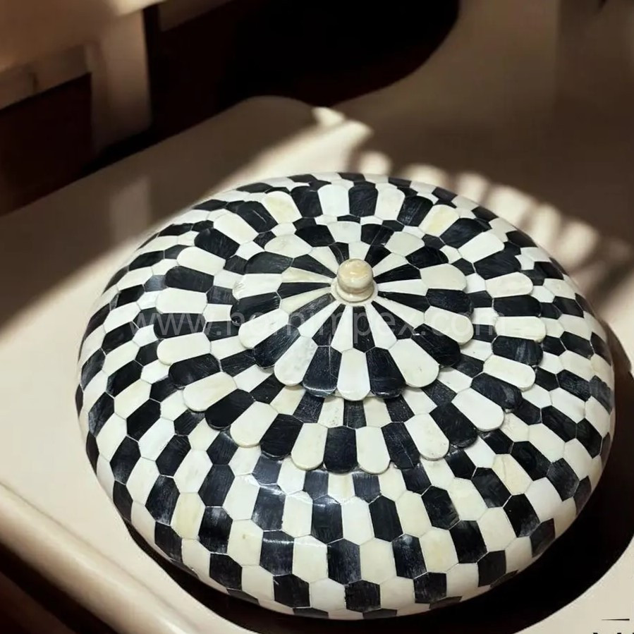 The contrasting colors of black and white (or natural bone off-white) give it a monochromatic and contemporary look that beautifully complements any interior. The intricate pattern is repeated on the lid, which is topped with a small knob for easy handling.