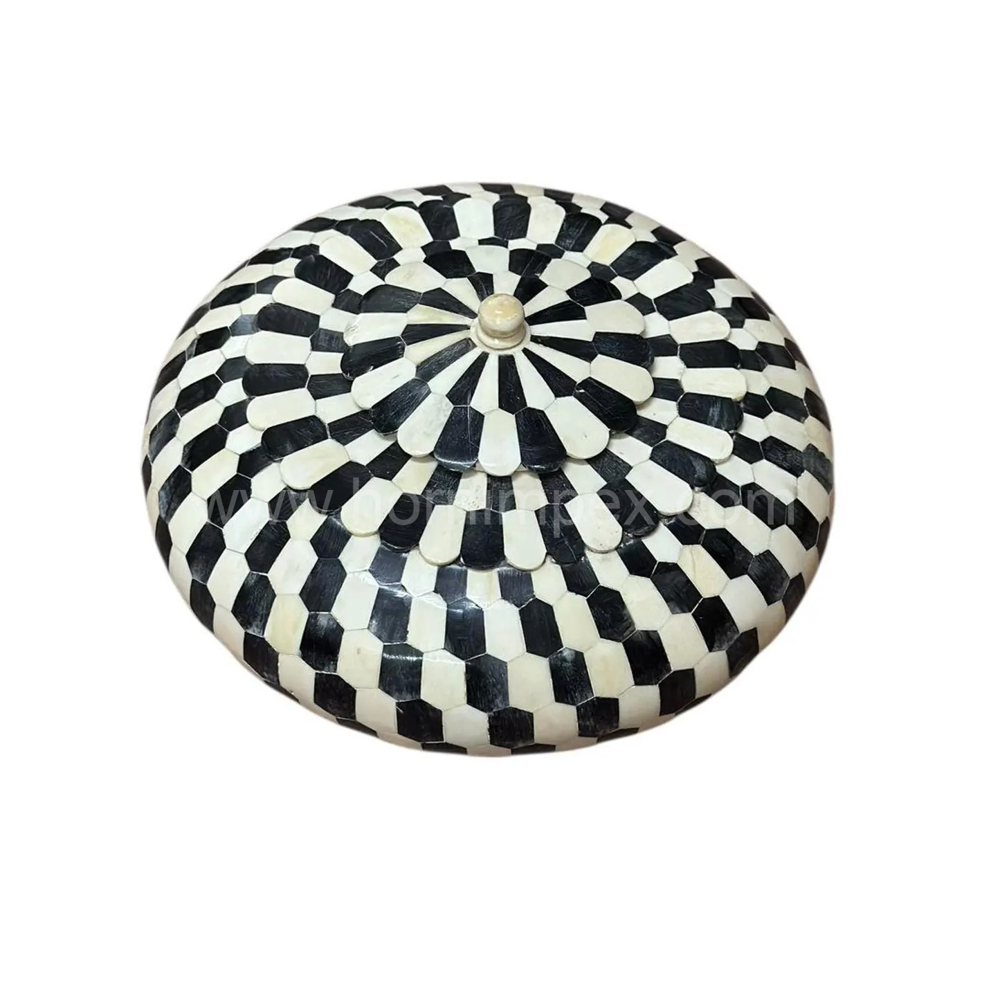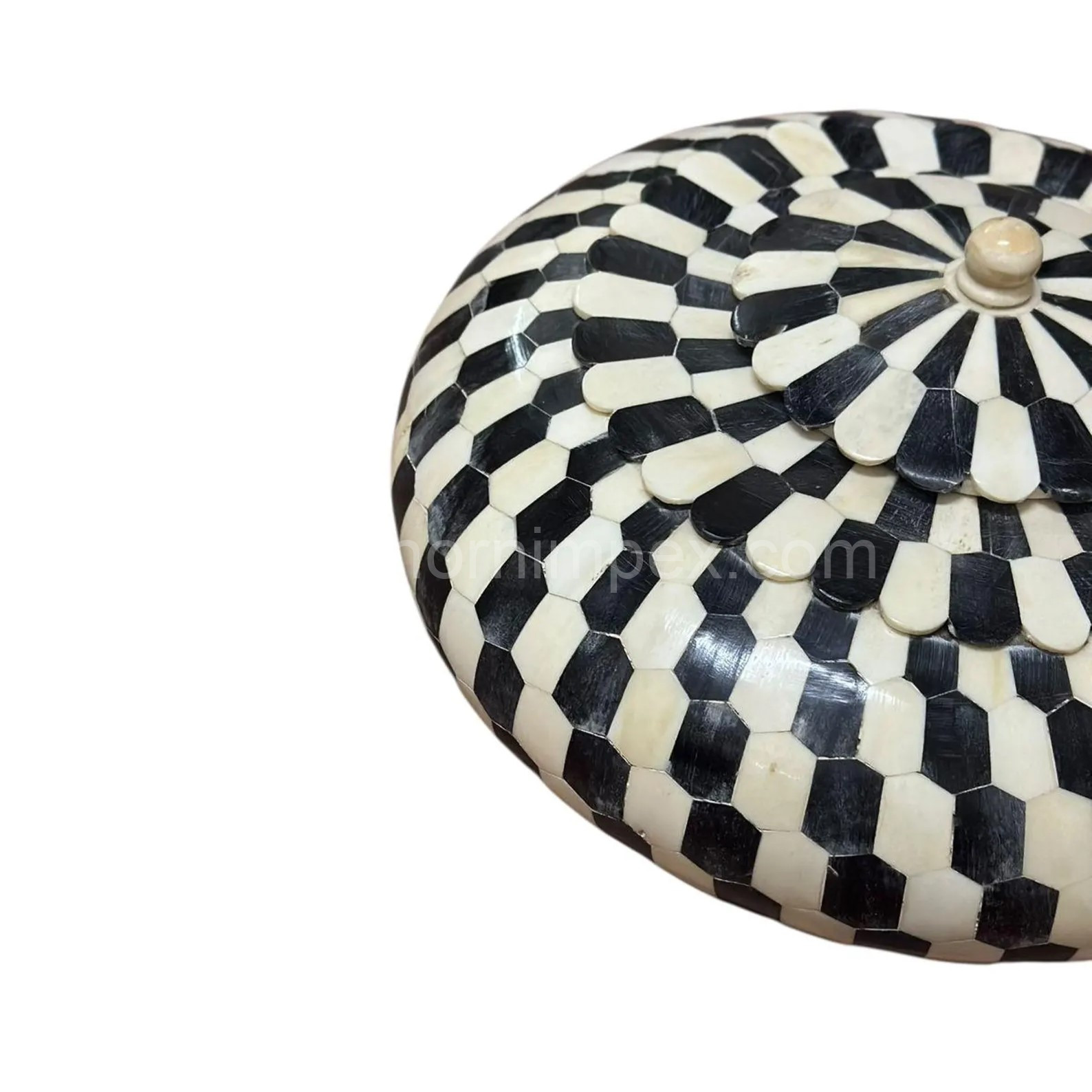 HornImpex presents this exquisite and artistically crafted lidded box, perfect for adding a unique touch to any home or office decor. This beautiful box is a prime example of traditional Indian craftsmanship, featuring meticulously cut and inlaid pieces of bone (or horn) arranged in a captivating geometric pattern.