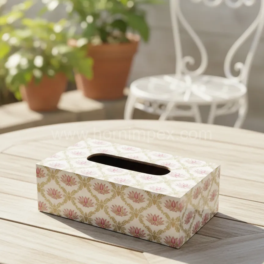 Add an elegant accent to your interiors with the Handmade Lotus Bone Inlay Tissue Box by HornImpex. Crafted with precision and care by skilled Indian artisans, this exquisite piece blends traditional bone inlay craftsmanship with a contemporary pink lotus and gold floral motif. Designed for the global décor and hospitality market, it embodies luxury, sustainability, and Indian heritage in one timeless creation.