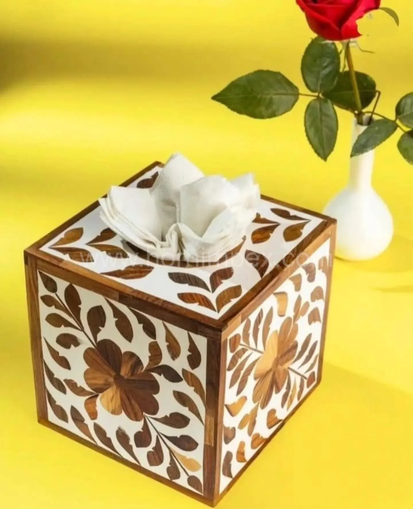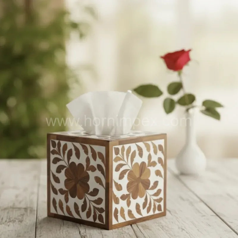 Elevate your home decor with this exquisite Floral Wooden Tissue Box Cover, meticulously handcrafted by master artisans in Sambhal, Uttar Pradesh, the hub for exquisite horn and bone handicrafts in India.