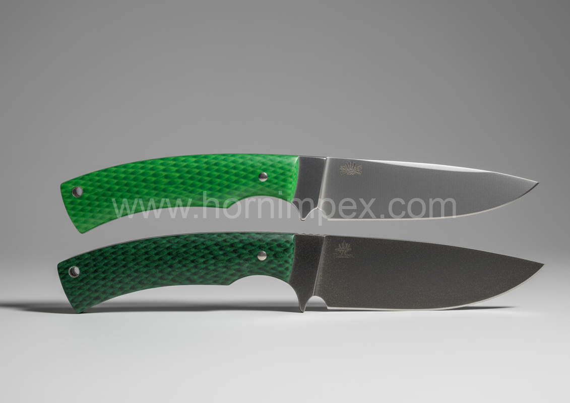 These Jigged Bone Knife Scales Dyed (Green) are made from authentic buffalo bone, a durable and eco-friendly natural material known for strength and polishability. Each piece is handcrafted in Sambhal, Uttar Pradesh—India’s heritage center for horn and bone handicrafts—by skilled artisans working under HornImpex’s quality standards.
