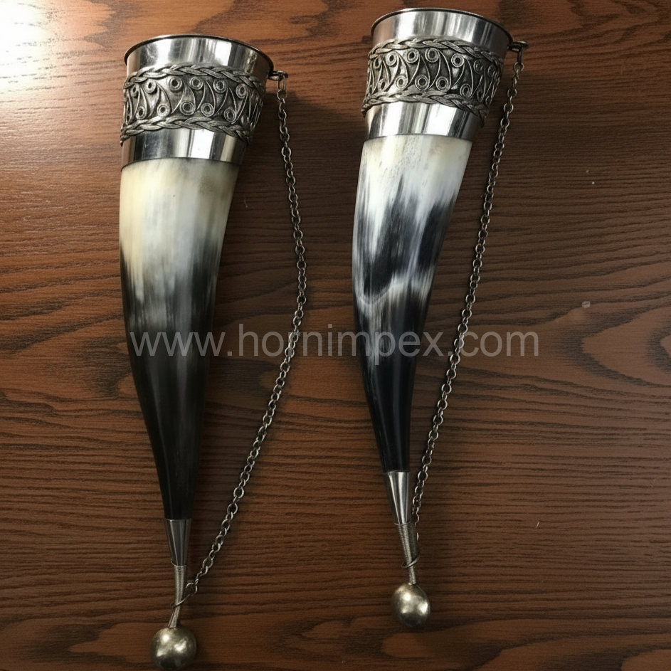 Handcrafted from 100% natural buffalo horn, this Viking-style drinking horn features a smooth polished finish, ornate metal rim, and hanging chain. Ethically sourced and artisan-made in Sambhal, India, each horn is unique in texture and color. Ideal for historical reenactments, décor, or gifting, this export-quality piece is designed for global buyers seeking authenticity and sustainable craftsmanship.