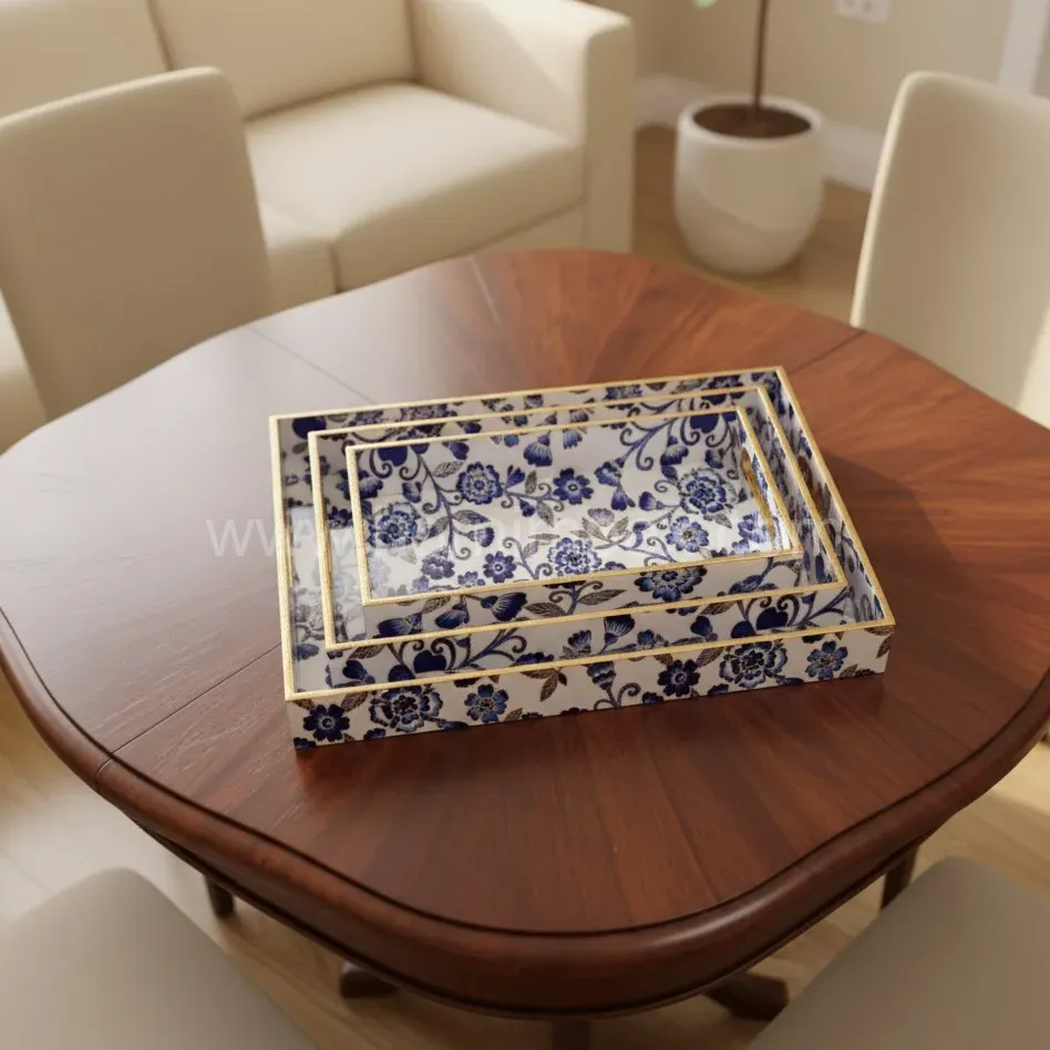 The trays showcase an intricate blue floral design with golden detailing, reflecting a fusion of Mughal and Persian aesthetics. The rich color palette makes them a timeless decorative piece for modern or traditional interiors.