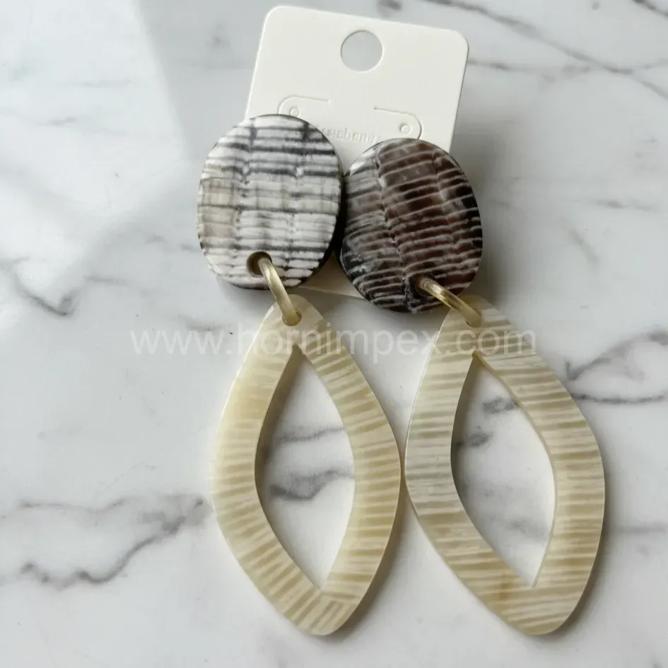 Our collection of wholesale natural horn drop earrings features modern, versatile designs, including the striking geometric patterns and smooth polished finishes that appeal to global markets. The natural variations in the horn result in unique, beautiful color patterns—from deep ebony to mottled cream—ensuring no two pieces are exactly alike. These earrings are exceptionally lightweight, providing comfort for the wearer, a key selling point for retailers seeking sustainable bone and horn earrings bulk.